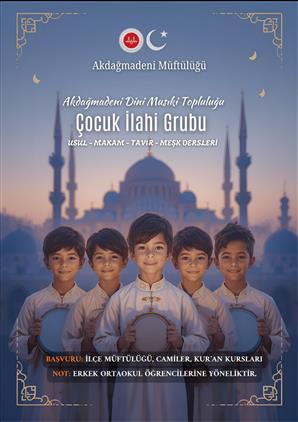 Akdağmadeni İlçe Müftülüğü olarak ilçemizde önemli bir eksiklik olan Büyükler İlahi Grubu’nu 2024 yılında oluşturduk ve bu grubumuzla birçok programda gönüllere dokunduk. Şimdi ise erkek ortaokul öğrencilerimize yönelik, “Usul – Makam – Tavır – Meşk” dersleri ile yepyeni bir Çocuk İlahi Grubu kuruyoruz. Derslerimiz, İlçe Müftümüz Sayın Abdullah Çolak Hocamız tarafından verilecektir. Musikiye gönül veren, sesi ve heyecanı olan tüm ortaokul öğrencilerimizi bekliyoruz. Başvurular: İlçe Müftülüğü, camiler ve Kur’an kursları Başlangıç: Bayramdan sonra Gelin, ilahilerle gönülleri buluşturalım, geleceğin musiki neferlerini birlikte yetiştirelim.