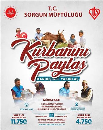 Vekaletle Kurban bağış alımı tüm hızıyla devam ediyor.. Haydi Sorgun yolumuzu bekleyenleri sevindirme davetimize desteklerinizi bekliyoruz.. Müftülük, Camiler ve Kuran Kurslarımıza yada ilgili hesaba, ad soyad ve telefon numarası yazarak eft yada havale yapabilirsiniz.