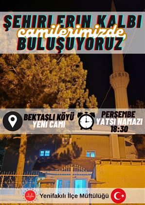İlçe Müftülüğü irşad faaliyetleri kapsamında Bektaşlı Köyü Yeni Caminde yatsı namazı buluşması düzenlenmiştir.Katılımlarından dolayı cemaatimize ve İlçe Jandarma Komutanımız Sn. Ercan DUMAN'a teşekkür ediyoruz.